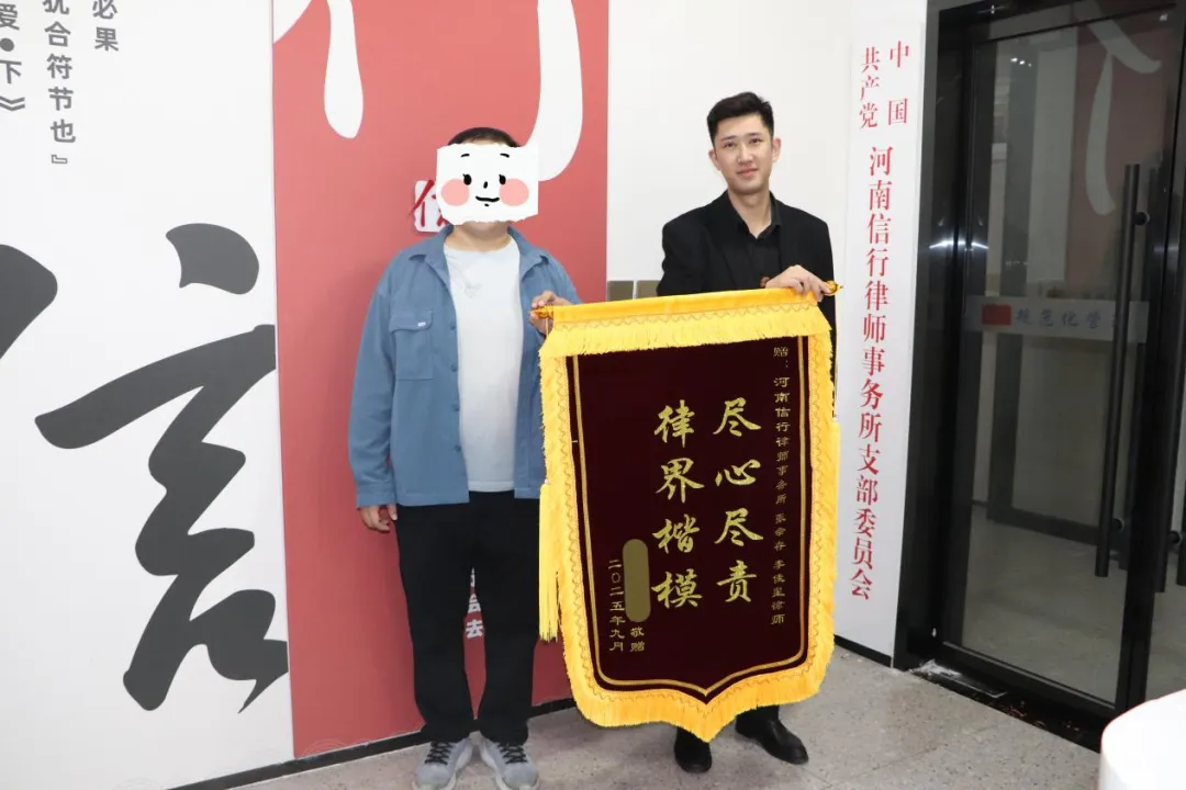 当 “律界楷模、尽心尽责” 的锦旗送到律所时,不仅是对张幸存律师、李佳星律师个人能力的肯定,更印证了河南信行律师事务所 “客户权益至上” 的服务理念。